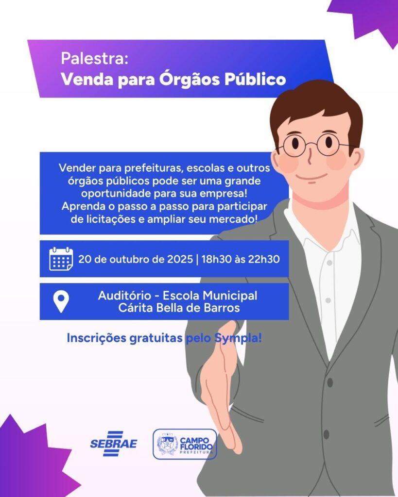A Prefeitura de Campo Florido, em parceria com o Sebrae, realiza no próximo dia 20 de outubro de 2025 uma palestra “vendas para Órgãos Público